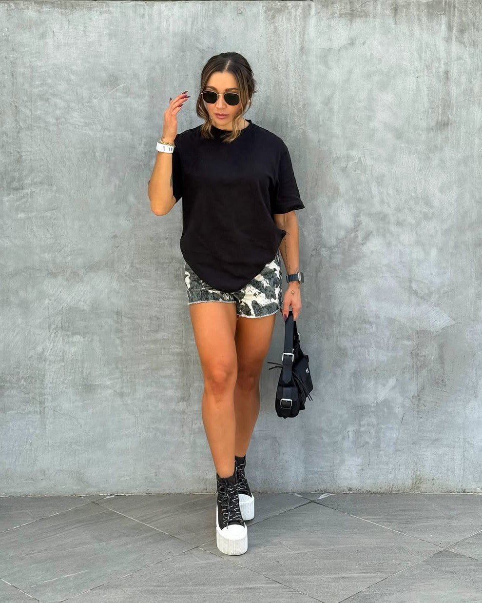 Gray doesn’t mean quiet—it means sharper. These mid-rise mini shorts flip the classic cow print into a monochrome statement: sleek, unexpected, and magnetic. Cut short and confident, they’re made for the girl who doesn’t chase trends—she redefines them.