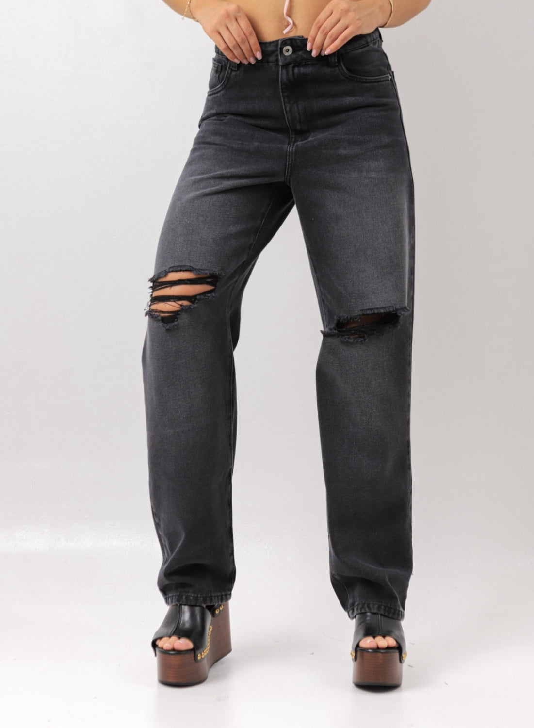 This Mom Fit hugs the waist and softens through the leg for that iconic ‘90s silhouette. The dark washed finish enhances its sculpted shape and gives it a sleek, urban feel. Distressed openings at the knees add contrast and texture.