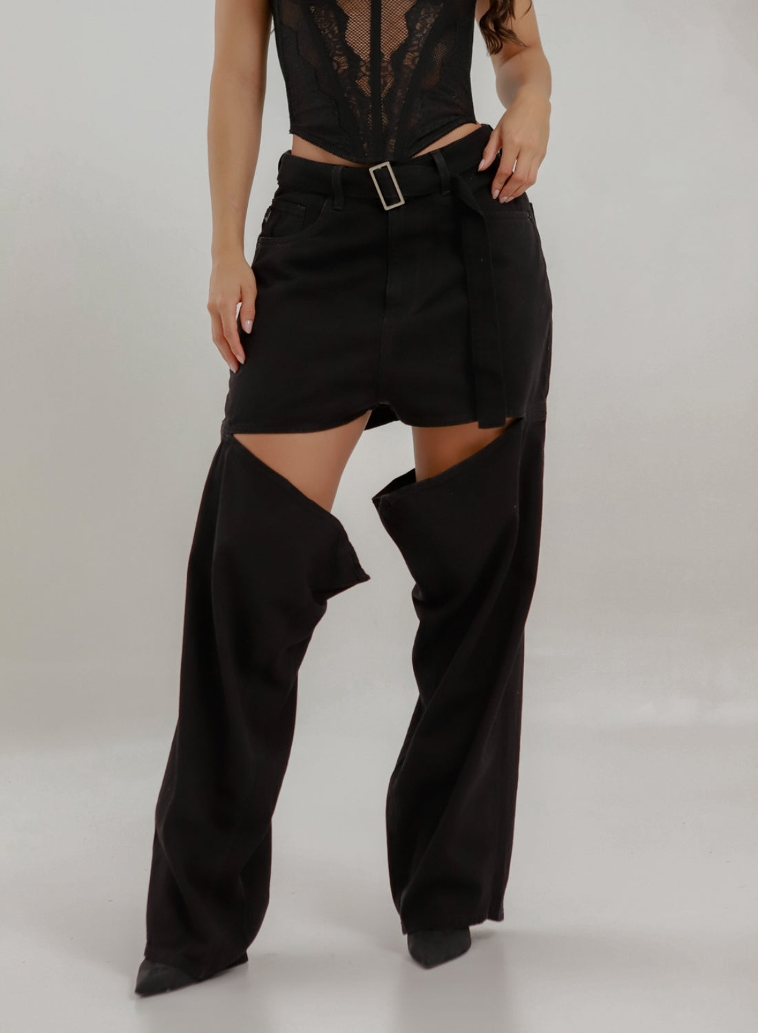 Reimagine denim with these barrel-style low-rise jeans featuring deep leg slits and a built-in tie belt. The structured denim keeps its shape while giving off a laid-back, deconstructed vibe. Designed for fearless fashion lovers, this piece blends Y2K nostalgia with avant-garde appeal, making it the ultimate statement denim for any season.