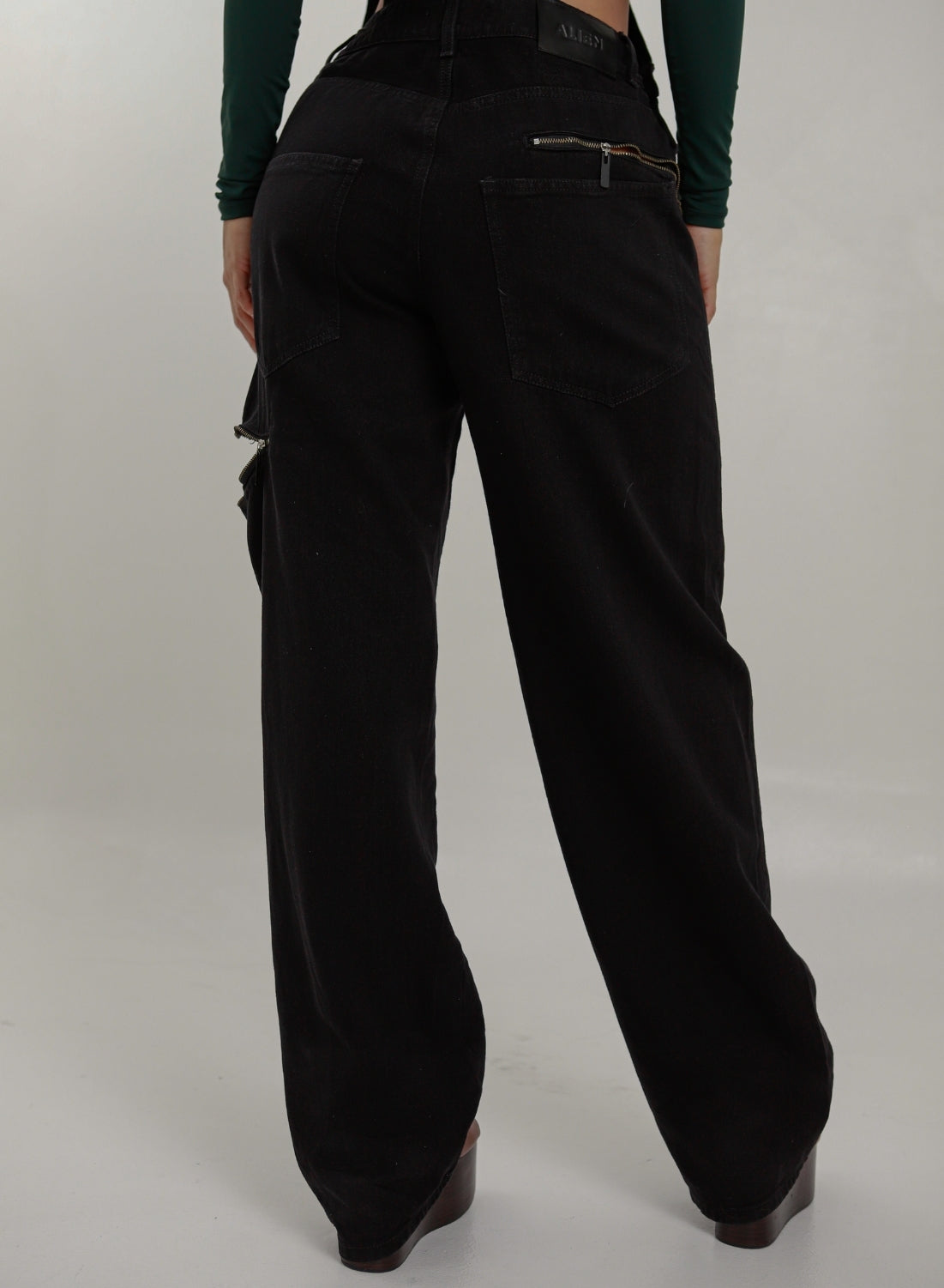 The straight-leg cut balances the fitted upper body, while the front bib pocket adds a utilitarian touch. A statement piece that combines attitude, structure, and versatility.