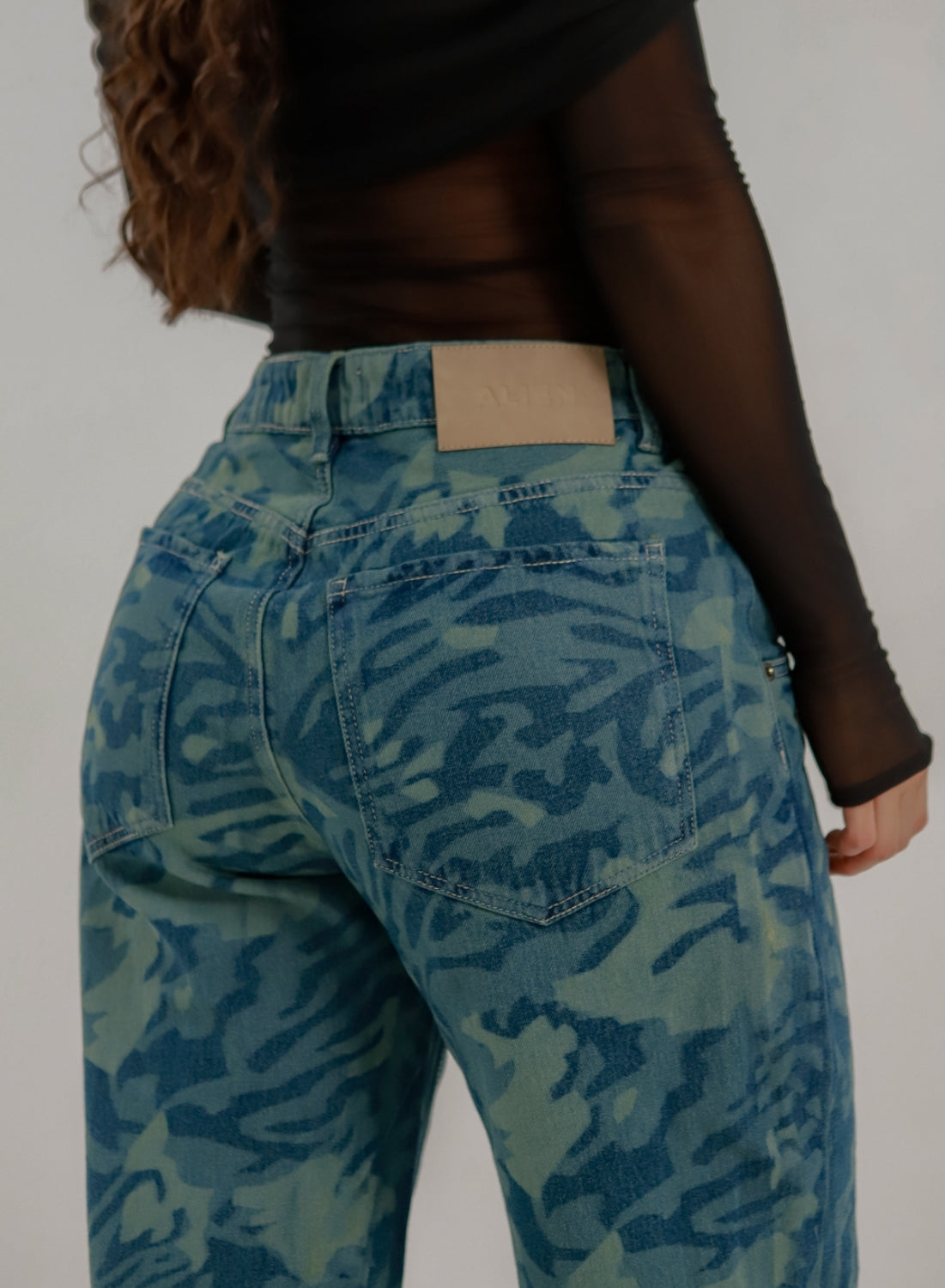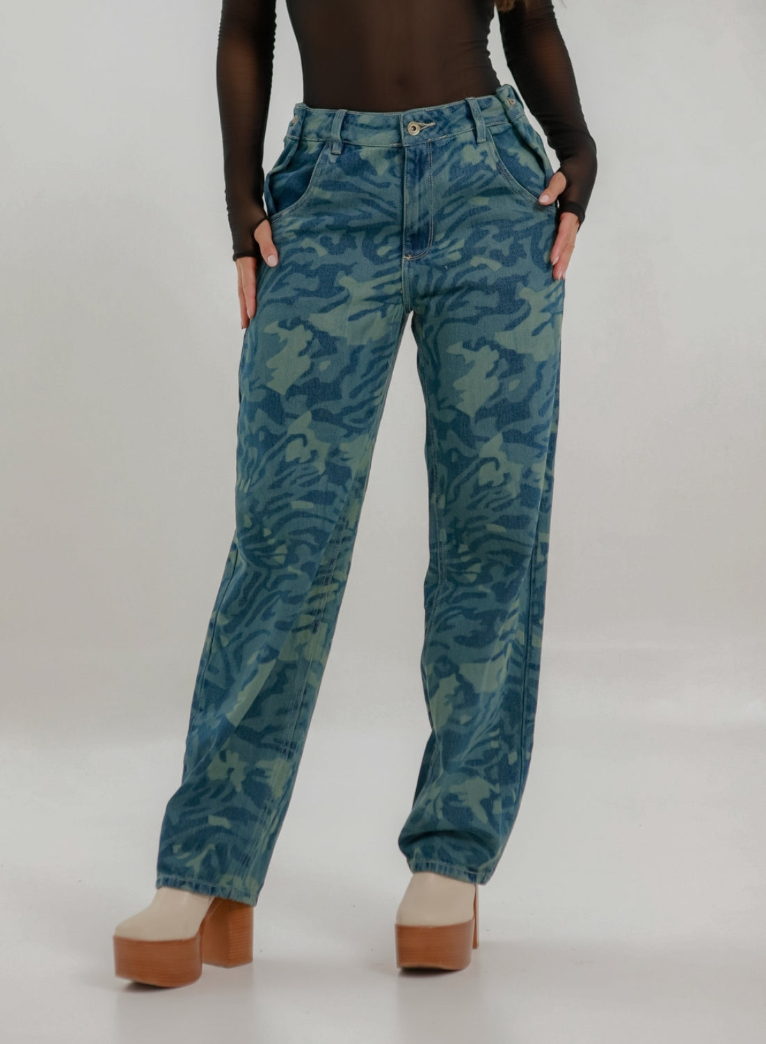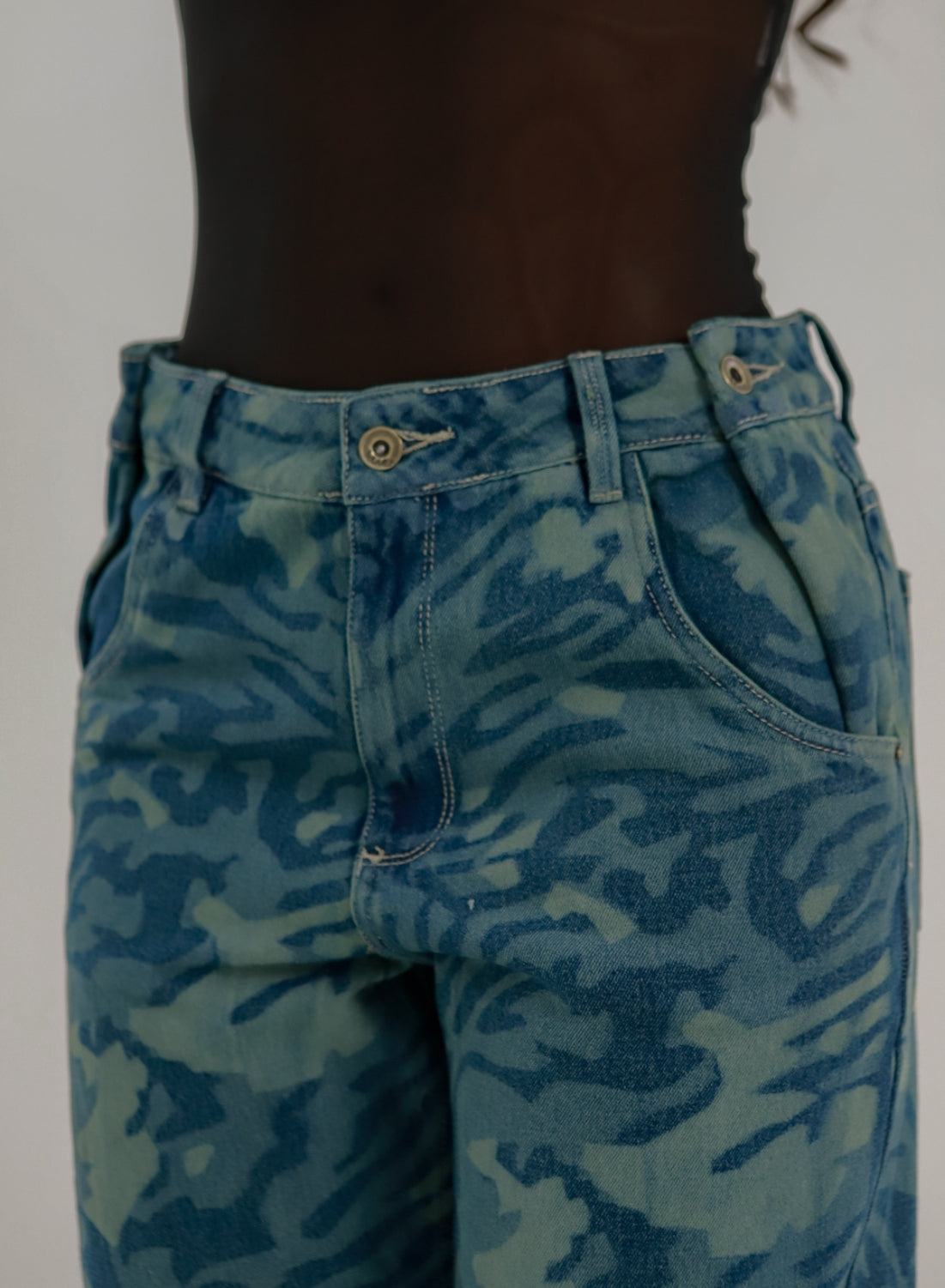 These boyfriend jeans bring a fresh twist to a classic relaxed fit. Featuring a straight-leg silhouette and an adjustable waist button for a personalized fit, they are crafted from durable denim with a laser-etched pattern that creates a subtle camo-inspired texture. The engraved detailing adds dimension and character without overpowering the design, making these jeans a standout piece for casual, street-style looks.