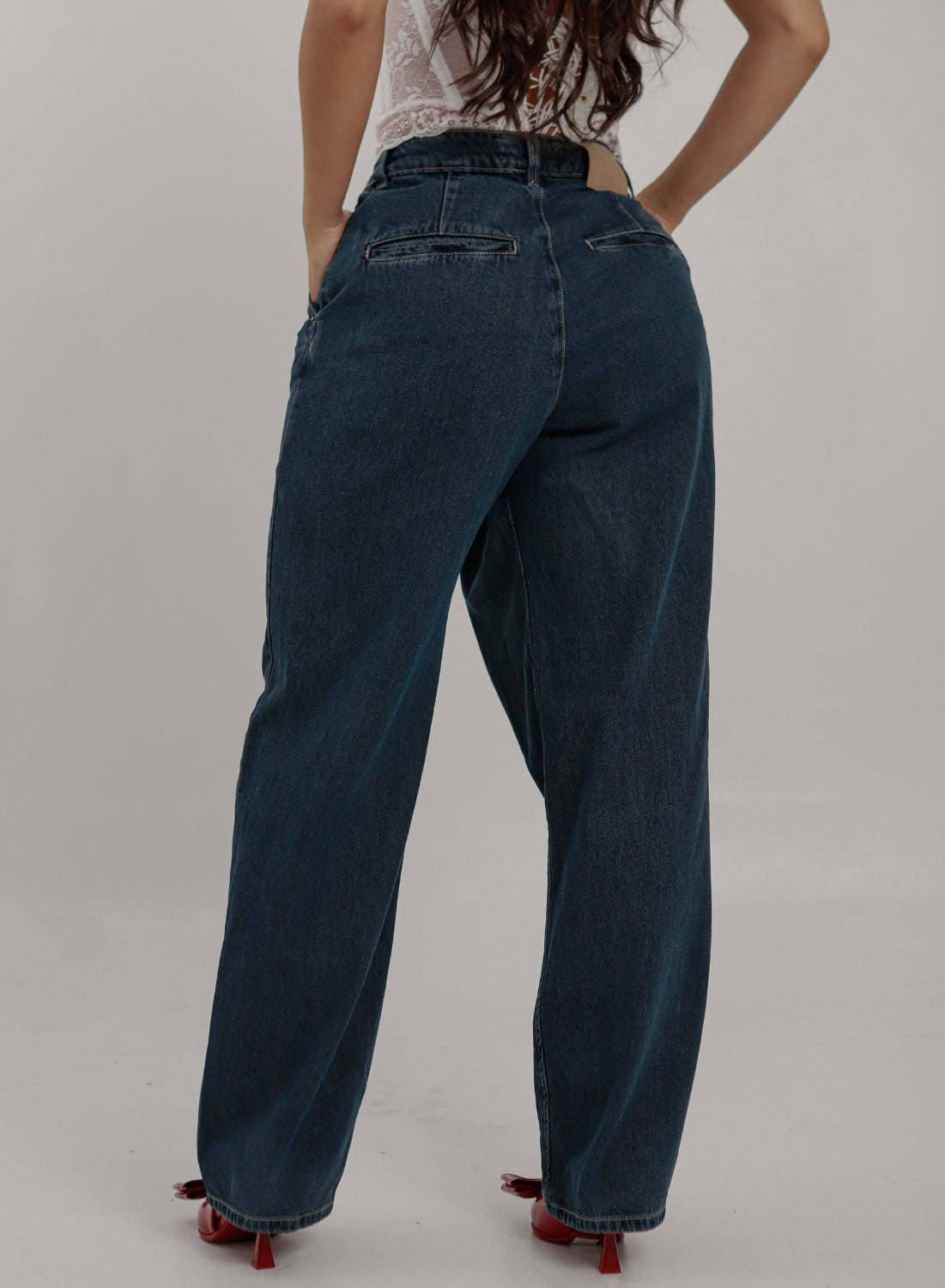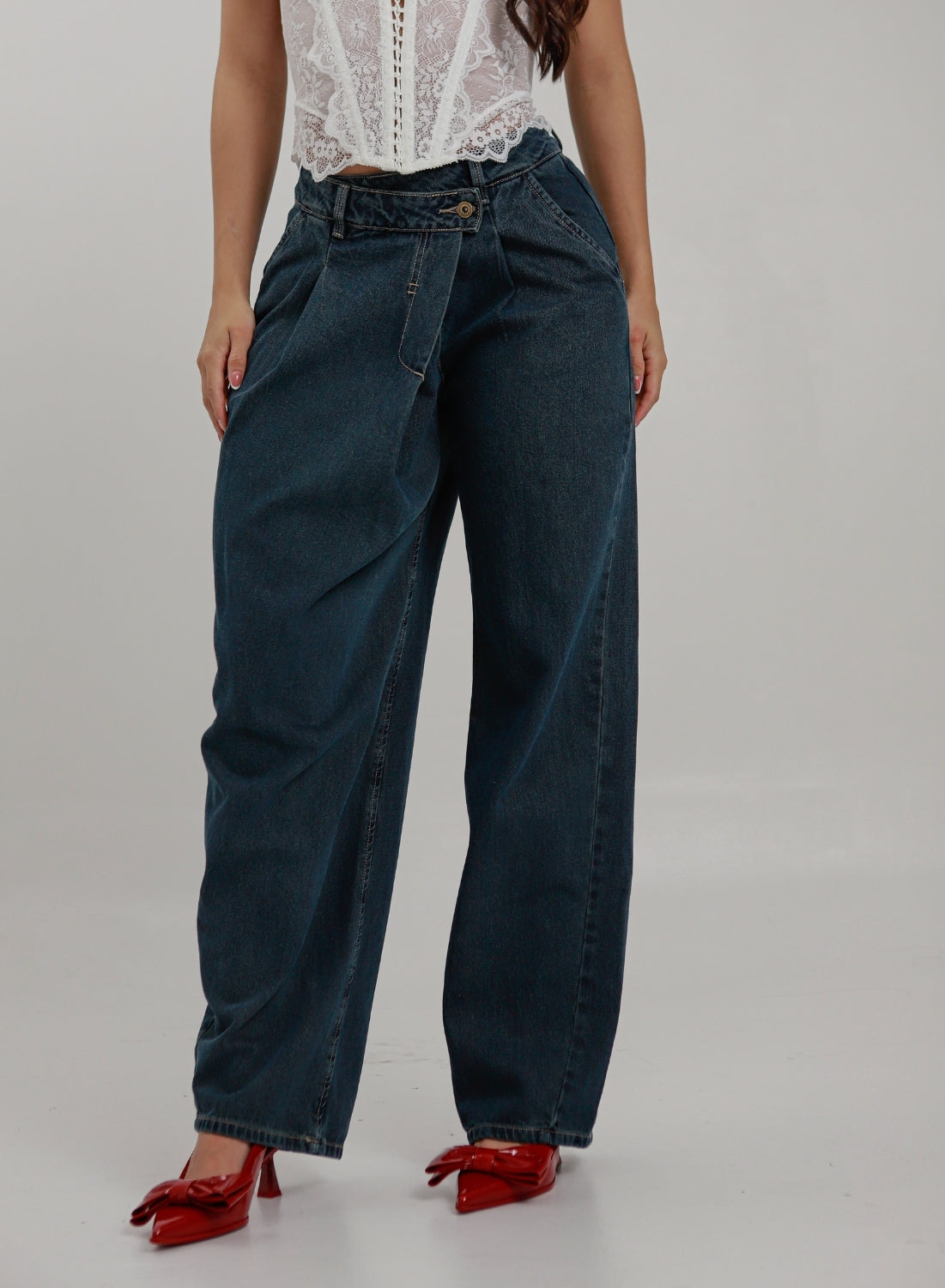 A modern interpretation of tailored denim. These wide-leg jeans stand out with a crossover waistband and a minimalist button closure—no zipper, creating a sleek, uninterrupted front.