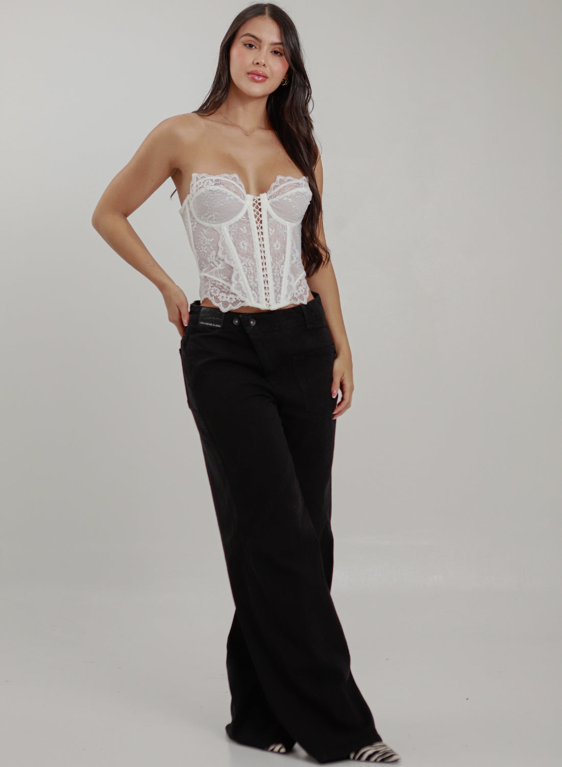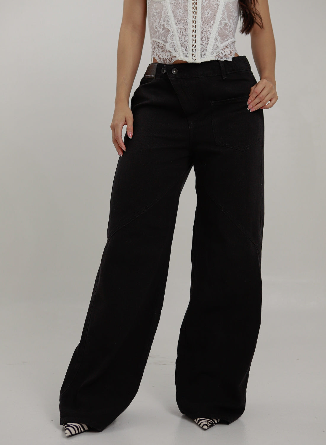 From the cross-over waist and off-center buttons to the bold leg seams that slice through the denim—this silhouette knows how to command attention. The patch pocket adds utility with a twist, keeping things practical but never predictable. Perfect for days when you want to make an entrance… or leave an impression.